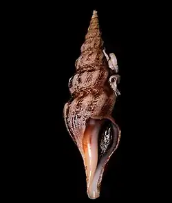 The length of the shell attains 55 mm.[2] The shell is spindle-shaped with an elevated spire. Whorls are angled at the periphery, featuring distinct, obliquely elongated nodules that resemble ribs. Otherwise, the shell is sculpted only by growth lines and fine, closely spaced spiral threads. The outer lip has a moderately deep, U-shaped anal sinus just below the suture, with a convex edge below this point.[2]