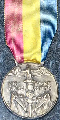 Under the royal decree of 31 January 1926, the Kingdom of Italy extended eligibility for the medal to members of the Voluntary Militia for National Security (Italian: Milizia Volontaria per la Sicurezza Nazionale, or MVSN), commonly called the "Blackshirts."[1] By royal decree of 15 July 1938, members of the Italian Armed Forces also became eligible for the medal.[4]