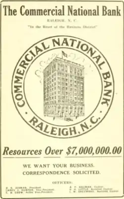 Commercial National Bank was a bank formed in Charlotte, North Carolina, on 18 February 1874, which was a predecessor to the American Commercial Bank which then helped form North Carolina National Bank. NCNB changed their name to NationsBank in 1991 and then again to Bank of America in 1999 through a series of mergers and acquisitions. Commercial National "is the oldest national banking institution in North Carolina."[1] Commercial National Bank and the American Trust Company shared a building in Charlotte prior to their merger in 1958 as American Commercial Bank.[2]