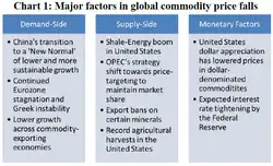 Global commodity prices fell 38% between June 2014 and February 2015. Demand and supply conditions led to lower price expectations for all nine of the World Bank's commodity price indices – an extremely rare occurrence. The commodity price shock in the second half of 2014 cannot be attributed to any single factor or defining event.[6] It was caused by a host of industry-specific, macroeconomic and financial factors which came together to cause the simultaneous large drops across many different commodity classes. Amongst these, the transition of China's economy to more sustainable levels of growth and the shale-energy boom in the United States were the dominant demand-side and supply-side factors governing the downturn in global commodity prices.[7]