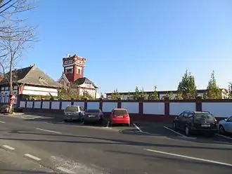 The abattoir was built between 1904 and 1905 according to the plans of Hungarian architect László Székely, on a vacant lot located between the Fabric and Elisabetin districts.[2] The complex spread over 11 cadastral jugerums and initially had 11 buildings: for animal housing, slaughterhouses, cold rooms, offices, laboratories, even homes.[3] László Székely's design for the communal abattoir was regarded as a success from the outset. As a result, he was commissioned to design similar facilities in Zrenjanin, Pančevo, and Sombor (in present-day Serbia), Kiskunhalas (Hungary), and Arad (Romania).[4] The city milk factory operated in the premises of the abattoir, and in 1937 a meat canning factory was established, the production of which later ceased.[5] The abattoir reduced its activity after 1990, and in 1992 it was permanently closed. After the numerous demolitions in the years that followed, the central tower, the side halls, the gate and the two statuary groups survived from the abattoir complex.[6]