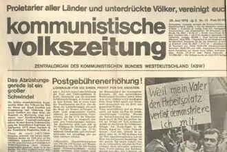 The Communist League of West Germany[1] (Kommunistischer Bund Westdeutschland; KBW) was a Maoist organization in West Germany which existed from 1973 until 1985. The KBW contested the general elections in 1976 and 1980 in West Germany and was rated as the strongest of the German Maoist parties from 1974 until 1981. After 1982 the KBW was virtually inactive and was finally dissolved completely in 1985.