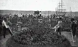 In 1895, the first gardens were founded in New York City by a committee of the New York Association for Improving the Condition of the Poor (AICP). The committee promoted the idea of gardening on vacant lots following the success of the first community gardening program in Detroit as a way to address food insecurity and lessen the reliance on charities and taxpayers.[1] The committee also advocated for gardens as a way to develop skills in the hopes that gardeners would relocate to the country. The gardens were located in Long Island City on 7,200 city lots donated by William Steinway. Allotments for the roughly 100 families who tended the land ranged from one-quarter of an acre to eight acres. By the end of the first season, the program was deemed a success growing $11,000 worth of produce with a clear profit margin for farmers.[2] In 1898, the AICP published a report about the gardening program as an ideal solution to unemployment and listed similar projects in nineteen cities.[1]