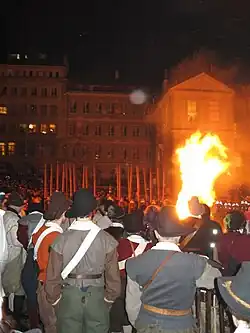 The Escalade was celebrated immediately after the attack of the Savoyards, but the patriotic commemoration became very important only in the middle of the 19th century (in 1860).[1] In this time, Geneva builds monuments in memory of the Escalade. The first processions with historical costumes take place (1867–1868) - military and gymnastics groups compose the processions - and the famous Pot in chocolate is created (10 décembre 1881).
