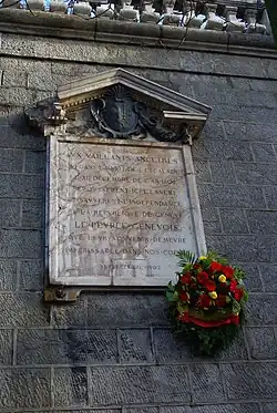 - ^ "Le premier jour de festivités (ve 9 décembre) constitue un hommage aux victimes de l'Escalade, ponctué de poses de couronnes à travers la ville, notamment près du monument aux morts à Saint-Gervais." in "Sortir.ch > autres sorties > la Compagnie de 1602 fait revivre le temps de l'Escalade". Archived from the original on 2013-01-15. Retrieved 2012-06-10.