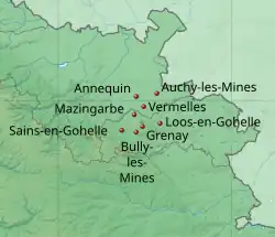 The German offensive in the summer of 1914 only invaded the eastern part of the Pas-de-Calais mining region. After the first Battle of the Marne from 6–10 September 1914, the "Race to the Sea" established a front line that cut through the mining basin. The Germans were stopped to the east of Vermelles.[11] The concession was cut in two along a line from Auchy-les-Mines to Liévin, with Mines 4 and 8 occupied by the Germans.[12] The men who had not yet been mobilized were evacuated on 4 October 1914 in the face of the German advance, and production was suspended until 22 October 1914. Mine 4 (Vermelles) was recovered in December 1914, but Mine 8 (Auchy) was not recovered until the German troops withdrew at the end of the war.[12] The British liberated Loos in the Battle of Loos of 25 September – 8 October 1915.[11] This front was then relatively stable throughout the war.[11]