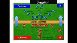American teams use 11 players, while Canadian teams have 12 players on the field per side. Both games have the same number of offensive players required at the line of scrimmage, so the 12th player in the Canadian game plays a backfield position on offence, whereas this is usually a defensive back on defence.[8]