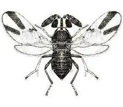 Comperiella bifasciata is a tiny black wasp with two white bars on the head. These are more prominent in females, which also have dark patches on the wings, giving them the appearance of having a forked tail; the wings of males are unblotched.[1]