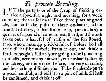 Recipes are provided for home-made medicines and remedies such as "To promote Breeding" for women wanting to become pregnant. The recipe calls for a spoonful of "stinking orrice"[c] syrup to be taken night and morning, and for "good ale" to be boiled with "the piths of 3 ox-backs,[d] half a handful of clary, a handful of nep (or cat-bos)",[e] dates, raisins, and nutmegs. The woman drinking this mixture "at your going to-bed" is enjoined "as long as it lasts, accompany not with your husband."[14]