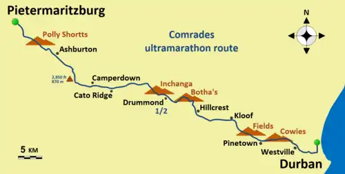 - ^ "Comrades route description for the up run". Nedbank Running Club. Retrieved 3 June 2025.