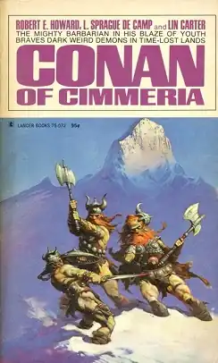 Conan of Cimmeria is a collection of eight fantasy short stories written by Robert E. Howard, L. Sprague de Camp, and Lin Carter and featuring Howard's sword and sorcery hero Conan the Barbarian. Most of the stories were originally published in various fantasy magazines. Lancer Books first published the paperback collection in 1969, and reprinted the book in 1970, 1972, and 1973.[1][2] After Lancer's bankruptcy, Ace Books took over publication.[1] Ace published its first edition in May 1977 and reprinted it in August 1977, 1979, 1980, 1982 (twice), 1984, 1985, 1990, and 1993. Sphere Books published the first British edition in 1974 and reprinted that edition in 1976 and 1987.[1][2] The book has also been translated into German, Japanese, Spanish, Dutch, Swedish and Italian.[1] It was gathered together with Conan and Conan the Freebooter into the omnibus collection The Conan Chronicles (Sphere Books, August 1989).[2]