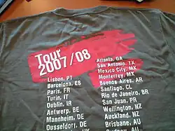 A concert T-shirt is a T-shirt that is associated with a concert or a concert tour, often for a pop, rock or metal band. Bands and musical groups often promote themselves by creating and selling or giving away T-shirts at their shows, tours, and events. A concert T-shirt typically contains silk screened graphics of the name, logo, or image of a musical performer or group. One popular choice of graphics on the rear of the T-shirts is a listing of information about the band's current tour, including tour cities (sometimes specifying venues) and corresponding dates.[1] In the 1960s, printed T-shirts gained popularity for self-expression as well for advertisements, protests, and souvenirs.[2] In 1968, rock producer Bill Graham co-founded Winterland Productions, credited as "the first concert T-shirt manufacturing company".[3]