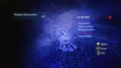 The other primary game mechanic is forensic investigation, which has been overhauled since the first game.[15][20][21] Once the player has been alerted that they are in a "study area", they must select the appropriate tool to record and/or collect the evidence. Upon doing so, the player is presented with multiple statements about that evidence and they must pick answers to communicate to Rosa in the lab.[8][9][20] For example, the player might need to determine if a wound is an entry or an exit wound, how a blood splatter occurred, whether a body crawled or was dragged, or a cause of death.[20][21][22] Picking the correct statements often reveals additional backstory and dialogue and counts towards a better end-of-level ranking, which unlocks upgrades, such as brass knuckles, body armor, and a holster.[20] The player has four forensic tools available to them; a GPS device, a Spectrometer, a Digital camera, and a UV light.[15][23]