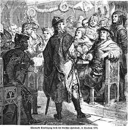 ![]() Delegates from the Confederation discussing peace terms with the Danes in Stralsund, 1370 | |