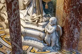 The current marble sculpture was created in 1866 by the Bergamo sculptor Giosuè Meli in the Neoclassical style.[5] Meli sculpted extensive detail on the angel's robes.