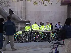 Due to the gradual increase of cyclists participating in Critical Mass, as well as complaints from motorists and concerns for safety, Houston Police Department officers helped direct the October 2013 Critical Mass ride in Houston, Texas by controlling intersections on the bike route.[11] In January 2014, after two months of providing free security and safe passage through heavy intersections, the Houston Police Department began considering options to charge the group for providing security for the event, citing similarities to providing security for funeral processions through the city limits.[12] Some Critical Mass riders have spoken out in protest of paying a fee to utilize extra security and escorting through busy intersections, while many others support paying fees for extra security to keep the ride safe,[13] which has led to increased discussions between the city and group for additional alternatives to the building conflicts.[14]