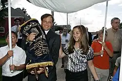 In addition to losing all of its Torah scrolls, Beth Israel lost all its furniture, and over 3,000 siddurs and mahzors, and almost all of its members' homes were flooded, forcing them to move.[8] The congregation did, however, receive assistance in replacing some of its assets; the Orthodox Union immediately sent Beth Israel 50 ArtScroll siddurs, and Brith Shalom Beth Israel Congregation of Charleston, South Carolina, and Congregation Shaare Zedek Sons of Abraham of Providence, Rhode Island each donated Torahs.[7] Hayley Fields, a 14-year-old from Los Angeles, heard of Beth Israel's difficult circumstances, and with the support of her mother, spearheaded a fund-raising drive, selling 3,500 watches. $18,000 was ultimately raised to buy a Torah, which was dedicated in August, 2006, two days before the first anniversary of the hurricane.[34] At that ceremony the National Council of Young Israel also donated 150 new Artscoll mahzors, in time for the High Holy Days.[8]