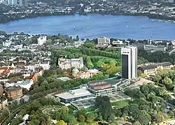 The CCH is near the Planten un Blomen, the University of Hamburg, and the Hamburg Dammtor station.[1][15] It is directly connected to the Radisson Blu Hotel Hamburg, which was opened in 1973 and renovated in 2009.[16]