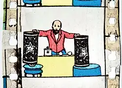 In 2014,[4] the Cinémathèque française received a donation from the collector François Binétruy: a short fragment of chromolithographed animated film, rotoscoped from an unidentified 1896 Méliès film and showing Méliès himself performing a conjuring trick. Such fragments of animation had been manufactured from 1897 onward in Germany and France, for home use in toy projectors.[5]