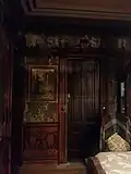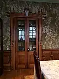The second parlor, also known as the "drawing room" or "ladies salon" features white wallpaper depicting gnarled trees and fanciful scenes. It contains a large white tile fireplace and mantle straddled by ornately carved wooden griffons.