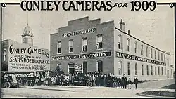 Originally built in 1900 by the Rochester Woolen Mill Co to produce pants made from wool fabric from their mill. The woolen mill company went bankrupt in 1903, and the factory was purchased by the Conley Camera Company (established by Kerry Conley and his brother Fred) in 1904.