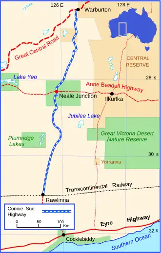 The Connie Sue Highway is an outback unsealed track that runs between the Aboriginal community of Warburton on the Great Central Road and Rawlinna on the Trans-Australian Railway. It lies entirely in the state of Western Australia, crosses the Great Victoria Desert and Nullarbor Plain, and is approximately 650 km (400 mi) long.