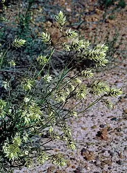 Conospermum glumaceum is an erect shrub that typically grows to a height of up to 0.5–1.7 m (1 ft 8 in – 5 ft 7 in) and does not form a lignotuber. Its leaves are linear, more or less clustered, 15–75 mm (0.59–2.95 in) long and 1–5 mm (0.039–0.197 in) wide with a small point on the tip. The flowers are borne in panicles in upper leaf axils, ending in dense, head-like spikes on a peduncle 15–40 mm (0.59–1.57 in) long. There are D-shaped to lance-shaped yellow bracteoles on the pedicels that age to brown. The flowers are cream-coloured, tube-shaped 0.75–1.7 mm (0.030–0.067 in) long. The upper lip of the perianth is egg-shaped, 0.8–1.3 mm (0.031–0.051 in) long, 0.75–1.2 mm (0.030–0.047 in) wide, and curved backwards, the lower lip joined for 0.5–1.3 mm (0.020–0.051 in) with oblong lobes 0.6–1.0 mm (0.024–0.039 in) long. Flowering occurs from September to November, and the fruit is a nut 2.7–3.0 mm (0.11–0.12 in) long and 2.0–2.4 mm (0.079–0.094 in) wide and covered with shaggy white to golden hairs.[3][2]