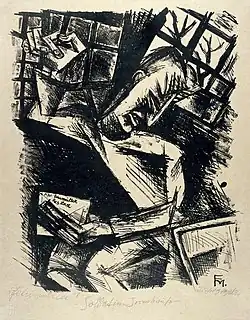 He attended drawing classes at the Dresden School of Arts and Crafts in 1911–12 before studying under Carl Bantzer at the Dresden Academy of Fine Arts.[1] In 1917 he performed military service as a medical orderly, and became a founding member of the Dresden Expressionist group Expressionistische Arbeitsgemeinschaft Dresden.[1] He achieved his earliest success as a printmaker. Felixmüller was a member of the Communist Party of Germany from 1918 to 1922.[1] He published many woodcuts and drawings in left-wing magazines, and remained a prolific printmaker throughout his career.[2] He was a close friend of the composer Clemens Braun of whom he produced a number of portraits and a woodcut depicting him on his deathbed.[3] Another subject of Felixmüller's was his friend and German expressionist poet Walter Rheiner. Felixmüller had done illustrations for many of Rheiner's works. In tribute following the news of Rheiner's death, Felixmüller's painting 'Der Tod des Dichters Walter Rheiner'pays homage to his deceased friend.[4]