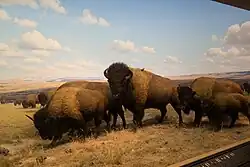In 2011–2012, the American Museum of Natural History undertook the restoration of 43 dioramas in its Bernard Family Hall of North American Mammals. In addition to repairing mounts, conservators worked on restoring the dioramas' set pieces and background paintings.[16] In order to restore the taxidermy mounts and specimens, conservators removed smaller animals from the dioramas and built temporary scaffolding around larger animals, such as the 500-pound bison. Many of the larger mounts are affixed to their diorama case and could not easily be moved without risking further damage. One of the main goals of the project was to bring back scientific accuracy to the specimens, including their fur coloring. The museum's conservators tested and developed a new method of treatment for recoloring furs that uses metal dyes instead of traditional materials, such as paints and hair dyes. Other details of specimens were updated and restored - the cougar's whiskers were replaced with porcupine quills to give the face a fuller appearance and veins were added to the antelope jackrabbit's ears to give a realistic appearance. In order to protect the restored taxidermy specimens and dioramas, UV-filtered lights were installed throughout the mammal hall.[17]
