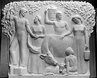 In 1937, Ortmayer was hired as instructor of sculpture at Rollins College by the president of the college, Hamilton Holt. As she was no longer employed by the government, Ortmayer was once again free to submit designs for approval. Ortmayer proceeded to enter a national competition for artists, receiving a runner-up position.[1] As such, she was commissioned to design two bas reliefs for federal post offices; one in Arcadia, Florida, which she completed in 1939, and one for Scottsboro, Alabama, completed in 1940.[1] The relief created for the Arcadia post office depicts a group of three adults (two men, one woman) and two children (a boy and a girl), along with a cow and her calf. The relief is entitled Arcadia[1] The second relief, created for the post office in Scottsboro, is a group of three different panels entitled Alabama Agriculture. The left panel depicts a man and a woman examining ears of corn. The middle and largest panel depicts cotton being harvested. The right panel depicts corn being harvested.[1] In 1941, Ortmayer was promoted from her original position as instructor of sculpture to assistant professor of sculpture. She was once again promoted, this time to associate professor, in 1945. In 1947, she was promoted to professor of sculpture.[1] During her time at Rollins, Ortmayer created a number of medals, most of which depicted then current and former members of the teaching staff at the college.[2] In 1968, Ortmayer resigned from Rollins college. She died, aged 85, having never married.[2]