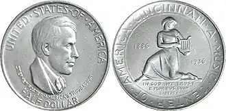 In the mid-1930s, Cincinnati businessman Thomas G. Melish formed a group calling itself the Cincinnati Musical Center Commemorative Coin Association in order to secure the minting of a half dollar commemorating the "50th anniversary of Cincinnati, Ohio as a center of music, and its contributions to the art of music for the past 50 years."[3] The obverse of the coin was to depict Stephen Foster, and the reverse a design emblematic of the goddess of music. The coin was to be dated 1886–1936. Despite the facts that there was no music-related celebration occurring in Cincinnati during that year, that Stephen Foster's connection to Cincinnati was dubious (he had worked for his brother as a bookkeeper for three years in the 1840s), that the year of 1886 did not seem to hold any special relevance to Cincinnati music and that the Cincinnati Musical Center was unknown to any of the established Cincinnati musical groups of the time, the mintage of 15,000 coins was authorized by the act of March 31, 1936.[4][5] The coins were to be sold at $7.75 per three coin set consisting of one coin from each mint; Philadelphia, Denver and San Francisco.[5] Ortmayer was commissioned to design the coin by the Cincinnati Musical Center. Her obverse design depicts a stylized bust of Stephen Foster, directly below which is the phrase "STEPHEN FOSTER–AMERICA'S TROUBADOUR". Along the periphery of the obverse is "UNITED STATES OF AMERICA" and "HALF DOLLAR". The reverse depicts a kneeling allegorical figure representing music. The figure is holding a lyre. On either side are the anniversary dates of 1886 and 1936. Directly below the figure is "IN GOD WE TRUST" "E PLURIBUS UNUM" and "LIBERTY". Displayed peripherally is "CINCINNATI A MUSIC CENTER OF AMERICA".[5]