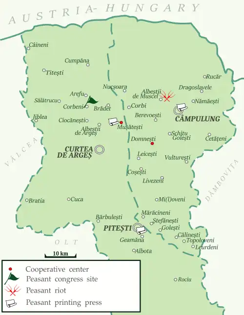 In order to better organize for his struggle, in 1881 Dobrescu founded at Mușătești a Peasants' Committee, a political network that brought together activists from Argeș and Gorj, later expanded into other regions of Muntenia and Oltenia. Its co-leaders were Schileru and Mucenic Dinescu, and its first congress was held at Corbeni in August 1882.[33] The previous month, Dobrescu and Schilleru had dined together in Bâlteni, where Dobrescu first outlined the idea of a "peasant party", which would have been focused on preserving the peasantry's constitutional rights; his program in this respect greatly enraged the political establishment, including the National Liberals, who favored expanding the urban middle classes, and the Conservative Party, focused on preserving landowner privileges.[34] During the early 1880s, Dobrescu was also considering corporatism, with each social group electing representatives exclusively from its own ranks—knowing that peasants had secured a permanent numerical advantage.[35]