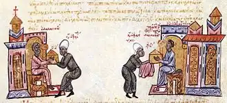 ![]() John the Orphanotrophos sends Ergodotes to Constantine Dalassenos, miniature from the Madrid Skylitzes | |