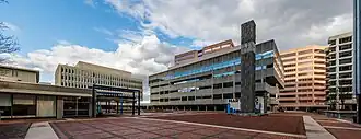 Constitution Plaza is a large commercial mixed-use development in Downtown Hartford, Connecticut. It is located on the east side of the downtown area, near the Connecticut's Old State House. The plaza consists of two main plazas, which are connected by an elevated bridge. The northern plaza is reminiscent of an Italian piazza, with a 40-foot-tall granite clock tower and patterned brick paving. The southern plaza is dominated by a central fountain.