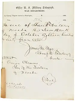 - ^ "National Archives Celebrates the 145th Anniversary of Nevada Statehood" (Press release). Washington, D.C.: United States National Archives. September 23, 2009. Archived from the original on January 16, 2025. Retrieved May 2, 2025.