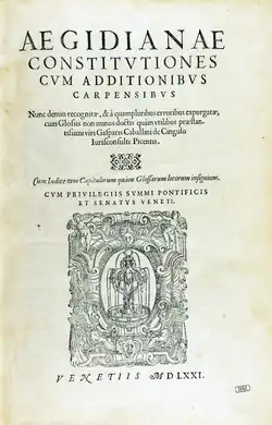 The Constitutiones Sanctæ Matris Ecclesiæ (English: Constitutions of the Holy Mother Church), informally known as the Constitutiones Aegidianae (English: Egidian Constitutions, Italian: Costituzioni egidiane), were six books of law which formed the first historic constitution of the Papal States. They were redacted at Fano by Cardinal Albornoz[1] between 29 April and 1 May 1357 at an assembly of all the vicars of the pontifical territories.