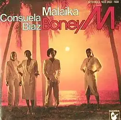 "Malaika" / "Consuela Biaz" is a double A-side single by German band Boney M. and the first single taken from their fifth album Boonoonoonoos (1981). It peaked at #13 in the German charts, their lowest placing so far after their commercial breakthrough. Boney M. would use the double A-side format in this period, typically with the A1 being the song intended for radio and A2 being more squarely aimed at discos. "Consuela Biaz" was first promoted as the A-side in Germany where the group performed it in pop show Musikladen. After a promotional visit to Spain where the group found "Malaika" had become a Top 10 hit, the title was remixed and then promoted as the A-side. It was the second consecutive Boney M. single not to be released in the UK and Japan.