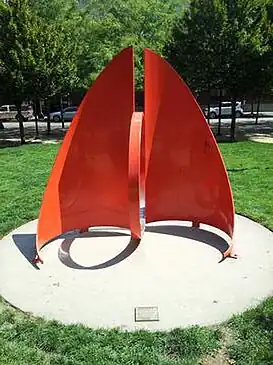 The painted steel sculpture measures 7 feet (2.1 m) x 8 feet (2.4 m) x 5 feet (1.5 m) and was donated by Ed Cauduro in 2002 in memory of his parents Ernest and Teresa Cauduro.[2][3] It is part of the City of Portland and Multnomah County Public Art Collection courtesy of the Regional Arts & Culture Council.[4] According to The Culture Trip, Contact II is "representative of Liberman's oeuvre as it is painted in red and its form centres on a circular shape, both of which were often repeated in his works".[5]