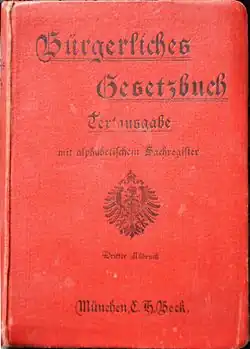 Some concessions made to the socialists, defined as "drops of social oil," appeared, for example, in paragraph 226, which stated that "the exercise of a subjective right is not permitted if its sole purpose is to cause harm to others," or in the provisions favoring workers contained in paragraphs 616 to 618.[111] The German Civil Code, not universally welcomed in its homeland, profoundly influenced 20th-century codifications, both European and beyond (consider Hungary, Greece, Poland, Brazil, Peru, Japan, and China). As of 2025, with some amendments, particularly concerning family law, the BGB of 1896 remains in force in Germany.[98]