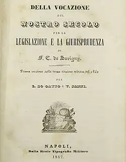 This treatise provoked the reaction of another jurist, Friedrich Carl von Savigny, who began a dispute with Thibaut[47] over whether or not to have a code. Savigny's response allowed for the emergence of a new doctrine and the so-called “historical school of law,” soon influenced by Romanticism and the thought of Gustav Hugo,[note 4][48] in complete opposition to natural lawism.[49][50][48] Savigny, taking to extremes some concepts from the works of Thomasius and Montesquieu, came to regard codes as a useless, or even harmful, operation. He believed that law should not be the exclusive production of a legislature but that it was to be constructed from history using the work of jurists, the only ones capable of understanding the spirit of the people (Volksgeist). Savigny brought as an example Roman law, which was, in his view, the best and which had been developed without substantial intervention by the legislature but by jurists.[51] The jurist, for von Savigny, thus had to be an expert not only in jurisprudence but also in history, since it was in it that he had to investigate to extrapolate norms; for him, “law is first created by popular customs and beliefs and then by jurisprudence, which is always the work therefore of inner forces acting silently and not of the arbitrariness of the legislature.” The adoption of a code would have “arrested the evolution of law, which, like languages, knows no moment of absolute stasis.”[52] As people evolved, the law had to evolve accordingly as well.[53] The historical school, however, did not exclude the intervention of the legislature altogether, as it was still deemed necessary to regulate certain matters, such as family law or procedural law to “contain the anarchies of lawyers and avoid lengthy trials,”[54] or to give accomplished form to custom, evidencing the actual will of the people without uncertainty.[55]