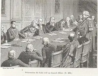 A new commission, composed of four respected and moderate jurists—most notably Jean-Étienne-Marie Portalis, author of the "Preliminary Discourse to the Civil Code"—was officially appointed on 12 August 1800. A first draft was presented in 1801 to the Council of State, which approved it after more than 100 sessions. Napoleon Bonaparte personally participated in many of these, especially those dealing with socially significant issues like divorce. The resulting "French Civil Code", soon known as the "Napoleonic Code", came into force on 21 March 1804.[4][10][11][12]