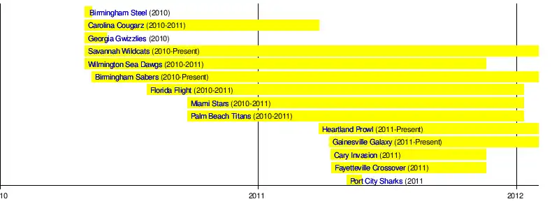 In 2012, the Raleigh Rough Riders were added to the league.[21] However, the 2012 season was never played. The league planned to return in the spring of 2013, but a lack of teams prevented that.