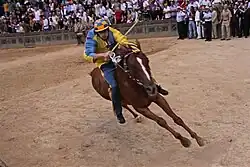 - ^ The zucchino is the helmet with the Contrada colors that jockeys are equipped with.