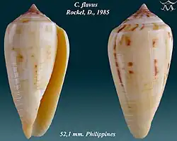 | Apertural and abapertural views of shell of Conus flavus Rockel, D., 1985 | |