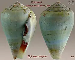 | Apertural and abapertural views of shell of Conus trovaoi Rolan, E.M. & D. Rockel, 2000 | |