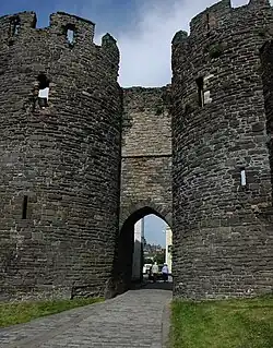The walls stretch along the south of the town with eight towers and two gatehouses. The Upper Gate formed the main inland entrance to the town during the medieval period, and, in addition to its twin towers, was originally protected by a stone barbican, of which some stonework still remains – a rare survival for town barbicans of this period.[48] A gatekeeper would have lived over the entrance during the medieval period.[49] The original defensive ditch and drawbridge have been filled in, however, and replaced by a modern road.[50] The second gatehouse, Mill Gate, was designed to allow access to the royal watermill that lay just outside the main town, and similarly features twin protective towers.[51] In between the two gatehouses are the remains of Llywelyn's Hall, a grand building originally built into the town walls by Edward I before being dismantled and moved to Caernarfon Castle in 1316.[52] Further along the walls is the mock-Gothic archway built in 1846 to accommodate the local railway, possibly drawing on similar designs used in Chester.[53] A unique set of twelve medieval latrines is built into the southern town walls, first constructed for the use of royal staff working in adjacent buildings in the 13th century.[54]