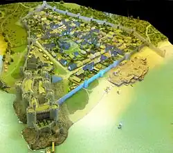 Before the English construction of the town of Conwy, the site was occupied by Aberconwy Abbey, a Cistercian monastery favoured by the Welsh princes.[2] The site also controlled an important crossing point over the river Conwy between the coastal and inland areas of North Wales, and was defended for many years by Deganwy Castle.[2] The English kings and Welsh princes had vied for control of the region since the 1070s and the conflict had been renewed during the 13th century, leading to Edward I intervening in North Wales for the second time during his reign in 1282.[3] Edward invaded with a huge army, pushing north from Carmarthen and westwards from Montgomery and Chester. Edward captured Aberconwy in March 1283 and decided that the location would form the centre of a new county: the abbey would be relocated eight miles inland and a new English castle and walled town would be built on the monastery's former site.[4] The ruined castle of Deganwy was abandoned and never rebuilt.[5] Edward's plan was a colonial enterprise and placing the new town and walls on top of such a high-status native Welsh site was in part a symbolic act to demonstrate English power.[6]