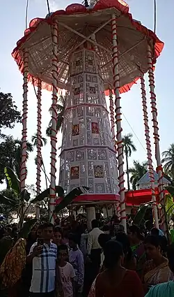 Rash Purnima is also celebrated with great joy in Nabadwip but unlike Nabadwip only Sri Krishna, the deity of the royal Koch kingdom is worshipped as Sri Sri Madan Mohan instead of the dual idol of Radha Krishna. People of all religions and backgrounds are welcomed in the event. The symbolic Rash Chakra is also constructed in the temple complex by a Muslim family from numerous generations which is rotated by people for seeking fortune and good luck. The chakra is made of bamboo and paper with floral designs and pictures of Lord Krishna.[1]