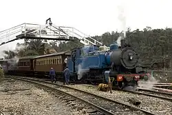 ![]() The relocated A-frame timber footbridge, pictured at its new location at the Top Points site, Zig Zag Railway above Locomotive 1049, Stormin' Normin, in 2008. | |