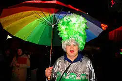 Cookie Buffet is the alter-ego of Washington, D.C., based gay rights activist Christopher Dyer. Dyer was born in Ann Arbor, Michigan on May 20, 1970 and moved to D.C. in 1975. He has since become a fixture of the gay community there. Dyer's primary work has been with LGBTQ+ youth and he established Youth Pride Day, an annual event since 1997. It is there that Dyer appears as Cookie. Dyer has used his alter-ego to raise considerable amounts of money for the community.[1]